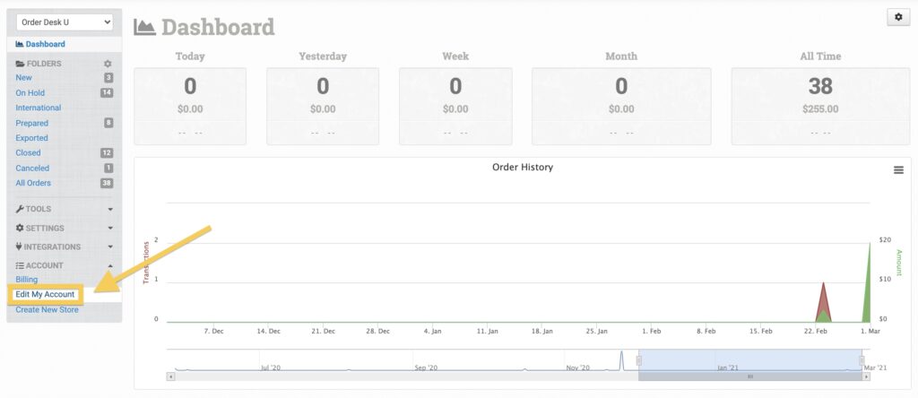 The User Account Information page is where you can go to manage your Order Desk login details, and can be accessed by clicking the Edit My Account link near the bottom of the left sidebar.