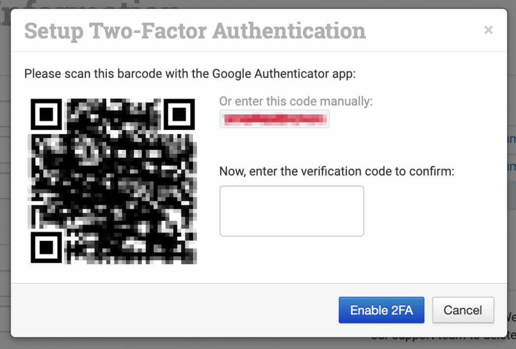 When you initially click the button to begin the setup process, you will be presented with a QR code along with a code that you can enter manually, depending on which method you prefer.