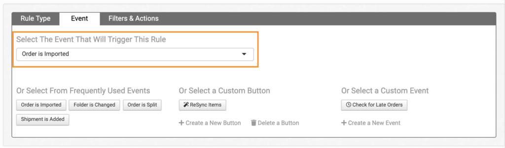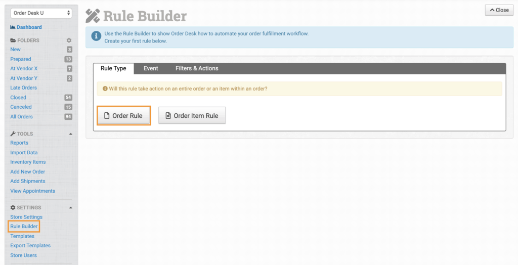 To create your split rules, in the Rule Builder, select the Order Rule rule type and choose your event, such as Order is Imported.