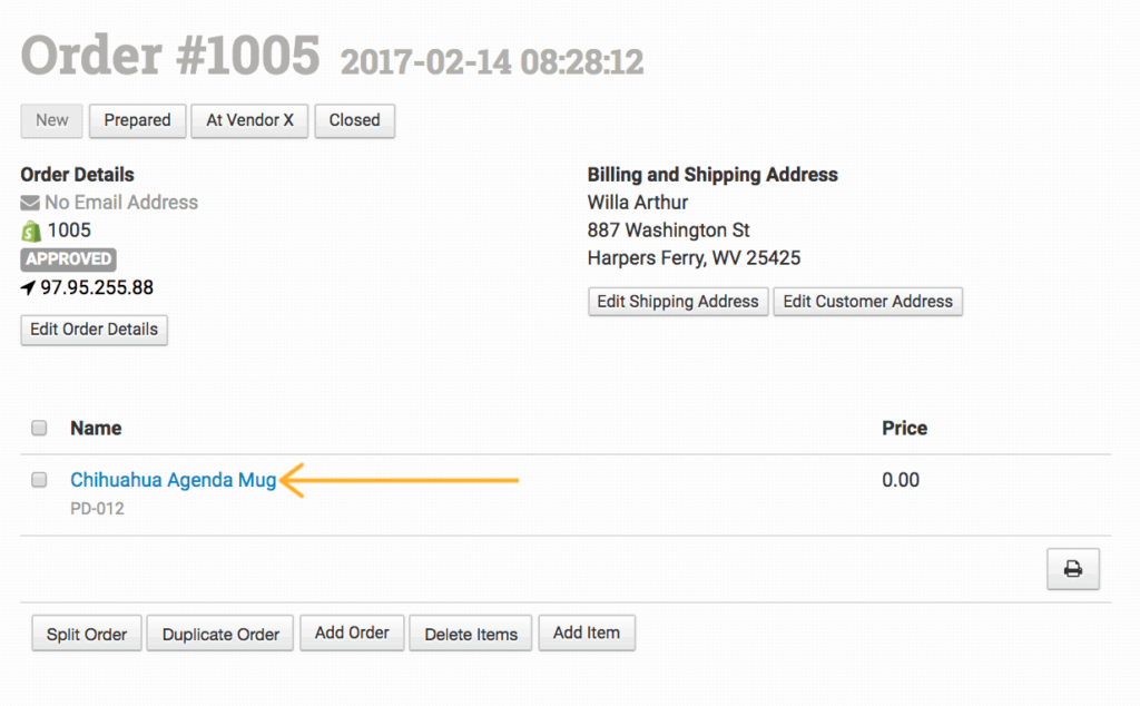 Once you have an order to work on in Order Desk, click on the item name in the order to add your print details (the print_sku and the print_url).