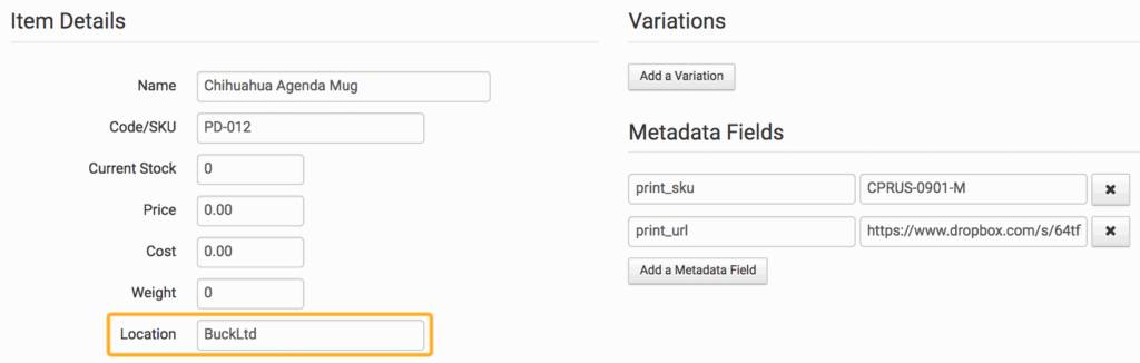 If you prefer, you can use the Add New Item option instead, but make sure to add your print_sku and print_url as metadata to your items and set the printer’s name as the location: