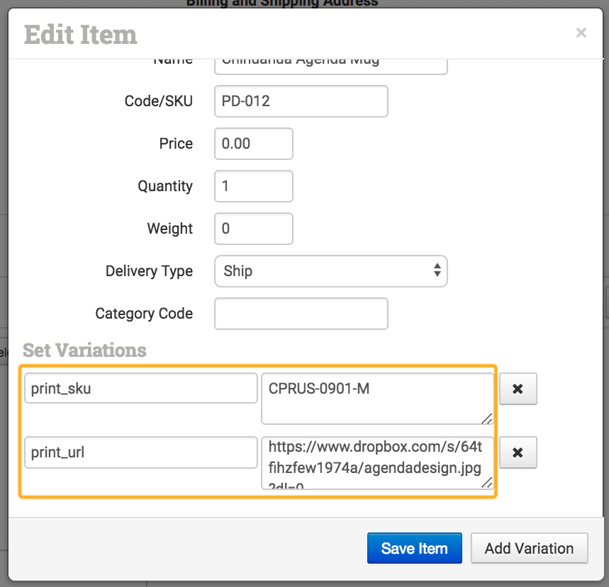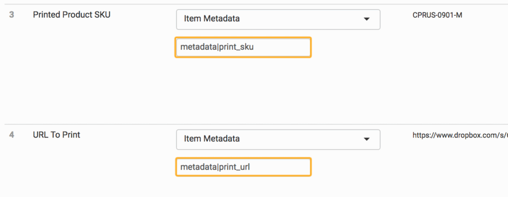 The two variations you will be adding are the print_sku and the print_url, using the printer’s product code for the item and the link to your artwork file as the values.