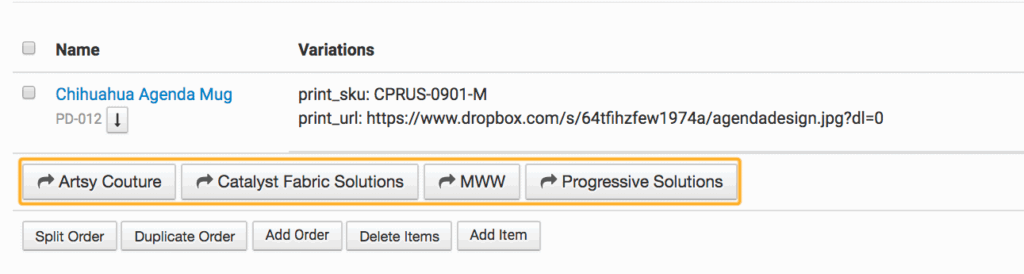 You’ll see a button for every print on demand integration you have under the item in your order. Click the appropriate button to submit your order to that printer.