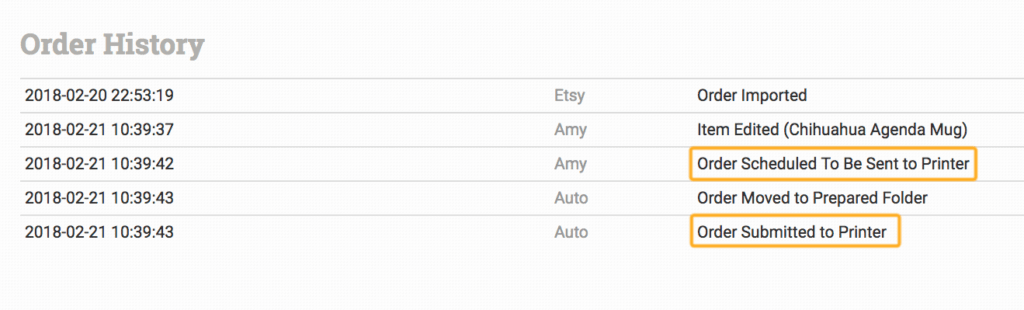 Scroll down to the Order History section near the bottom of the page. Order History shows all the events that happen to an order from the moment it is created. When you submit an order to an integration, an event is added to the history to say that the order was scheduled to be sent to the integration. If the submission was successful, an event is added a moment later to say it was submitted: