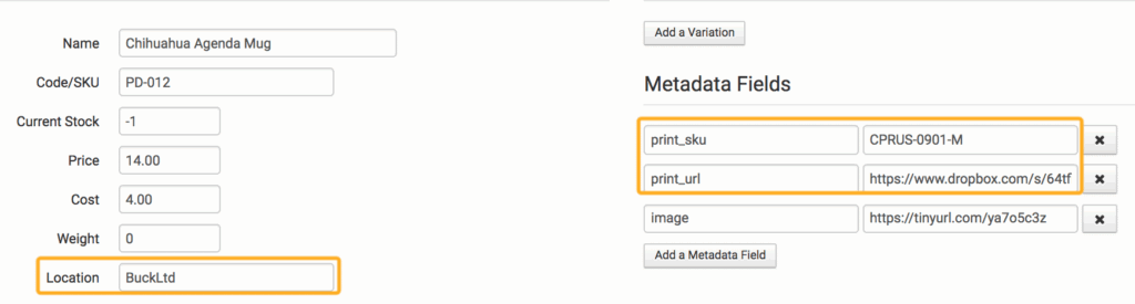 You can add your item information to each of the fields. The print_sku and print_url will be added to the metadata of the item. This will also add the printer name as the print location, which is necessary for splitting orders if you use more than one printer. We will cover splitting orders later in this guide.