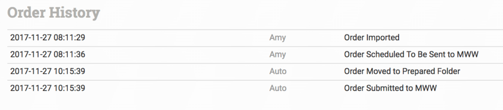 This section says when the order was imported or created, if anything was edited on the order as well as any other actions taken on it, including if the order was scheduled to be sent to a printer and whether or not the submission was successful.