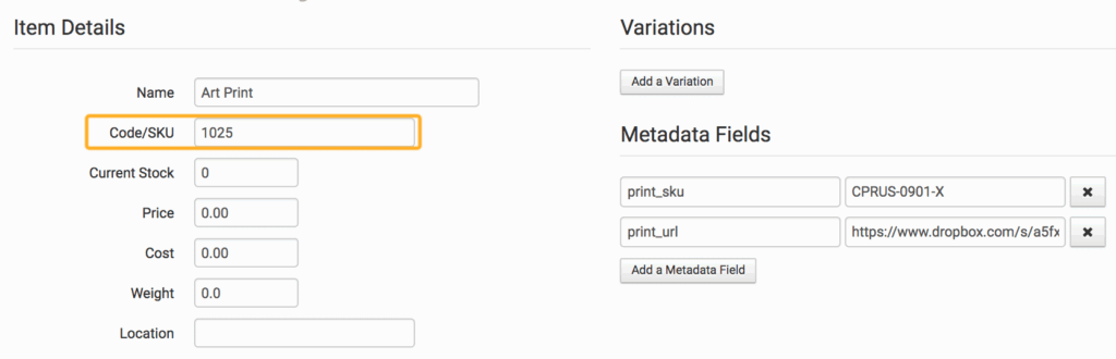 Each item needs to have your SKU saved in the Code/SKU field and all the print details added in either the metadata or variations fields.
