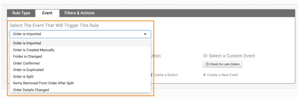 Choose the Rule Type—if you want the rule to take action on an entire order or on certain items within an order—and in the Event tab, you can see what events are available: