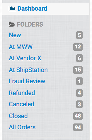 A good method for setting up your folders is to think of where an order currently is. For instance, if you send orders to more than one vendor or fulfillment/shipping integration, you can move orders into folders that say they’ve been sent but have not yet been fulfilled, such as “At Vendor X” or “At MWW” or “At ShipStation”.