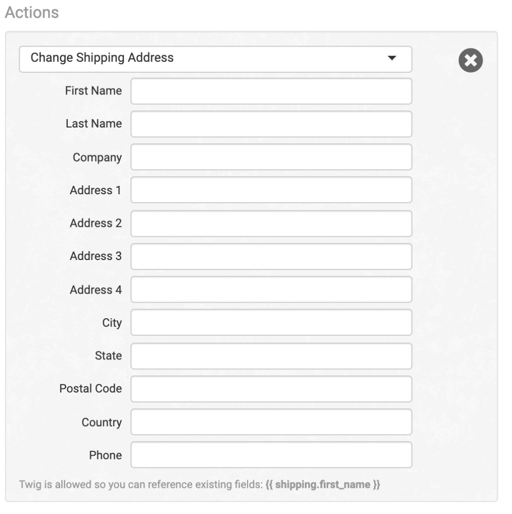 Change the shipping address on the order. Fill out each field or they will be left blank. Twig is allowed to copy the existing field into the updated information.